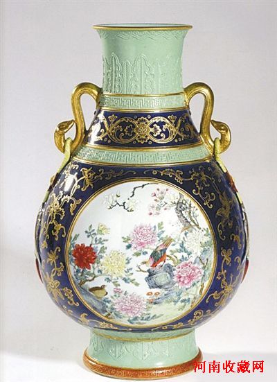 清乾隆霁蓝描金开光粉彩花鸟暗刻松石绿釉如意双耳尊(图⑥)