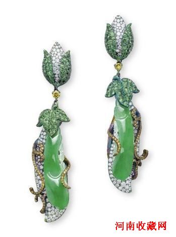 由亚洲珠宝设计师Wallace Chan(陈世英)精心打造的缅甸天然翡翠豆荚耳坠“豆蔻年华”(拍品编号1630,估价: 800,000-1,200,000港元/100,000-150,000美元)