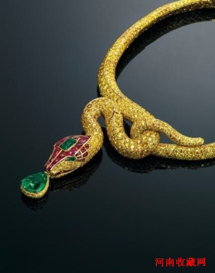 彩色钻石的拍品也同样瞩目,包括一对钻石耳坠(拍品编号1661),由两颗重约28.65及28.27克拉梨形彩棕黄色VS1 Type IIa钻石(经美国宝石学会鉴定)镶嵌而成,难得一见。另外,一条由Carvin French设计的独特的梨形哥伦比亚祖母绿项链(拍品编号1653)也令人惊艳,镶满明亮形黄钻的蛇形项链缀以棕黄色及橙色钻石,蛇头镶嵌红宝石及祖母绿,双眼则为祖母绿,蛇头吊着一颗约重12.29克拉的祖母绿,配以一圈明亮形黄钻,美态慑人。