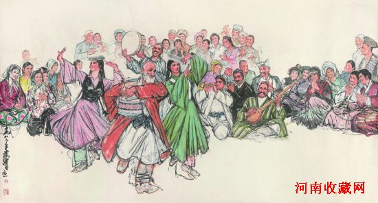 “澄道”-中国书画夜场中,黄胄《民族大团结》足有36平尺之巨,与其1959年为人民大会堂创作的作品为同一主题,表现“爱我中华”的宏大主题。七十年代末黄胄再赴新疆,重新汲取灵感,至八十年代后,进入新的创作盛期。“丰收”不仅仅是一个劳动者欢聚的场景,更是一种胜利、和平、安宁,收获新生活的开始。
