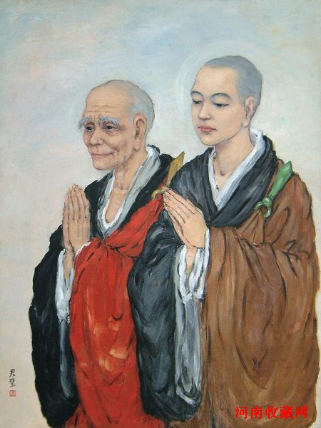 《禅者初心》为方君璧最为擅长的肖像画,描绘了两位并肩而立、正行佛礼的僧人,面容和穆,观之使人如沐春风。其中,年长者为日本高僧铃木俊隆。铃木俊隆是第一位将禅宗思想介绍到西方世界的重要日本僧人,他于上世纪50年代移居美国旧金山,建立了禅中心及西方第一所禅修院,弘扬佛法。此时,方君璧亦在美生活,得以机缘受听于铃木课下,并与之结下良好的友谊。方君璧共为铃木绘至肖像两幅,此件为较大一幅。画家以中国绘画的线条勾画出这两位僧人,成功捕捉了人物的神韵。大色块的运用,用色厚重,对比清晰,透出一股东方神韵。
