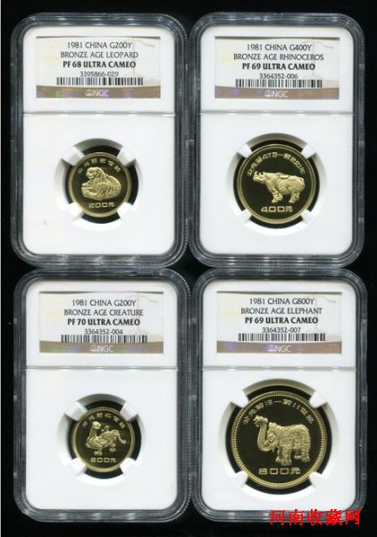 1981年出土文物青铜器第(1)组精制金币四枚一套(含1盎司、1/2盎司、2*1/4盎司、带盒、带证书 NGC PF70、PF69、PF68)