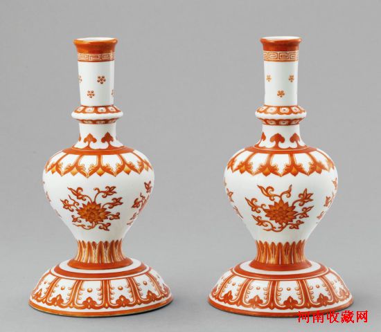 藏草瓶,亦称“甘露瓶”,为藏传佛教陈设用法器,御制甘露瓶用於在宫廷之中赏赐西藏僧侣之用,或置於佛堂之前,用於盛水或插草。藏草瓶是极具藏族特色的器物。明朝永乐年间曾试烧製青花和颜色釉藏草瓶,传世亦见成化青花缠枝花卉纹藏草瓶。入清以後,仅见雍正、乾隆官窑烧製过红彩和斗彩品种。该瓶外壁以矾红彩绘纹样。由上至下依次为回纹、朵梅纹、覆莲纹、仰莲纹、如意纹、变形覆莲纹、折枝莲纹、蕉叶纹、双重复莲纹。其釉汁匀净莹润,矾红鲜丽柔和,上下映衬,光彩夺目,体现出西藏地区传统造型与内地悠久的陶瓷烧造工艺高度完美的结合。足内无款,这与《乾隆记事档》的记叙相吻合,《记事档》载:乾隆十一年“二月奉旨烧造红花甘露瓶,俱不要款。”同年“五月初一日,唐英将按旨照样烧造得:红花白地甘露瓶四件……奉旨俱留下,其甘露瓶着唐英再烧造几件”的记载相符。乾隆十二年“二月二十九日,大臣海望来说:太监张玉传旨:著传谕唐英将甘露瓶陆续再做些来。”该瓶秀美的造型、精细的绘工、协调的色彩与精美的纹饰浑然一体。且成对出现,尤为珍罕。