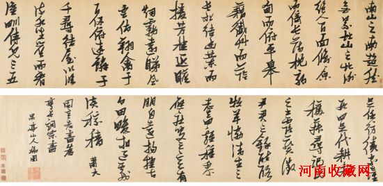 张瑞图《草书言志书卷》,是张瑞图在天启年间返乡期间隐逸之志的体现,在天启四年(1624),由于阉党和东林党之间的斗争越发激烈,张瑞图再一次告假还乡,居住在东湖之滨。直到次年的十一月升为礼部右侍郎兼翰林院侍读学士、协理詹世府事,并充《实录》副总裁。此次秋拍的另外一件手卷《后赤壁赋》也作于此段时间。另外两件《草书轴》虽不落年款,但用笔方硬,章法奇崛,更是张瑞图大字的精品之作。张瑞图《草书后赤壁赋》原为武汉文物商店旧藏,著录于《中国古代书画图目》第十八册。天启四年(1624),张瑞图再一次告假还乡,居住在东湖之滨。直到次年十一月升为礼部右侍郎,这件《草书后赤壁赋》作于东湖晞发轩,正是张瑞图隐逸之志的体现。