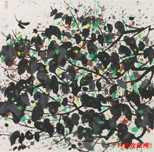 吴冠中1995年创作的《小鸟天堂》,70×70cm,纸本彩墨。此件作品曾参加“情感•创新——吴冠中水墨里程”2004年6月法国巴黎展和北京展,多次出版。这是吴冠中自1974年开始画水墨整整三十年的重要展出,也是其创作高峰的重要作品之一。“融和中西”之路最初是由吴冠中的老师林风眠开拓的。在林风眠的探索中,我们看到,传统水墨画一向只辅以淡彩或根本不赋彩,而他却常以浓墨重彩构筑画面,在清淡的水墨画中开了先河;传统水墨画一向以书法用笔作为规范,而他却无视一整套传统笔法,将疾速,流畅、爽利的露锋线条移入水墨画中,传统水墨画一向有自己的章法布局,而他却将西方的现代构成观念引入水墨画,从根本上改变了传统水墨画的画面格局。作为他的后继者,吴冠中在这一问题上更是表现出罕有的勇气,说明他们的目标正是要依据自己的艺术理想,重立笔墨新规范,重建水墨新原则。在这30年的水墨行程中,他留下的足迹足以证明,他在这一领域所作的是一种超越传统规范的全新开拓,他要在这一传统媒介中走出自己的路。