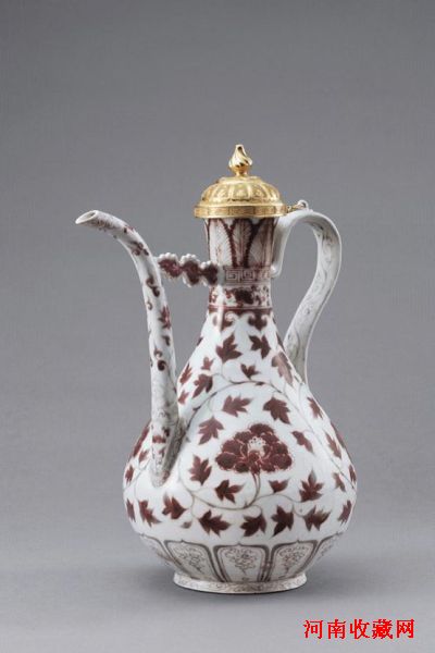 壶唇口,细颈,斜肩,硕腹,圈足。壶身作玉壶春瓶式,壶体一侧置弯曲细长的壶流,并以一云板形饰件与壶身相连,另一侧置曲柄,连接於颈腹之间,柄上端置一小系。壶通体绘釉里红纹饰,颈部分层绘焦叶纹、回纹、缠枝灵芝纹各一周,腹部满绘缠枝牡丹纹,壶流亦满饰缠枝花卉,壶柄绘有缠枝花卉及卷草等纹饰,近足处为一周变形莲瓣纹,足外墙绘卷草纹。足内满施白釉,无款。壶盖为鎏金錾刻,做花卉钮及莲瓣纹,有细链与壶柄相连。