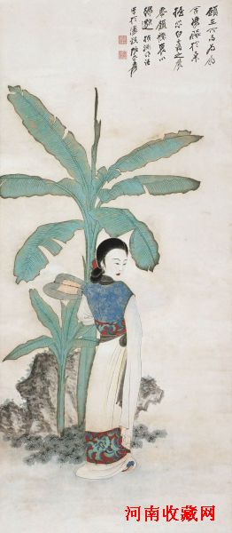 大千以“蕉荫仕女”为题材的作品,从1934年开始陆续有所创造。此帧系大千早期仕女画,根据陶渊明《闲情赋》的诗意而作,于濠镜(澳门古时别称)创之。《闲情赋》以浪漫的手法描写了一位作者日夜悬想的绝色佳人,幻想与她日夜相处,形影不离,甚至变成各种器物,附著在这美人身上,全赋以“十愿”的虚想,铺陈对佳人的依恋、追求和心愿不遂的“十悲”。大千画中仕女的线条特色,具有浓烈的明代人物画家吴小仙的仕女笔法特征。画中仕女头身比例采用六头身法,头大身小,气质温柔娴静,带有幽幽的闲愁,眉眼线条纤细柔婉,秋波流转,充分表现出大家闺秀的女性美。整幅画面清淡雅致,令人心旷神怡。