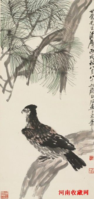 北京匡时首次推出的近现代书画夜场,精心斟选五十余件近现代名家扛鼎力作以飨各位藏家。整场夜宴荟萃了齐白石、张大千、傅抱石、徐悲鸿的多件精品,意在向近现代大师致敬。齐白石《松鹰图》、《居高声自远》寄寓老鹰如鹤寿千年之美意,老人画“松鹰”多作于定居北京之后,表达其对“盖世英雄”的呼唤,能求获此题材的非当时显达莫属,因而老人落笔也格外精心。