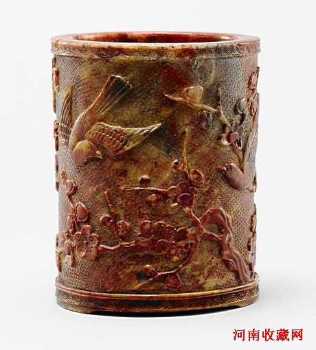 清康熙 寿山石刻喜鹊登梅笔筒H:12.8cm