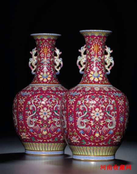 清乾隆 紫地粉彩龙纹夔耳瓶一对 以3504万的高价成交