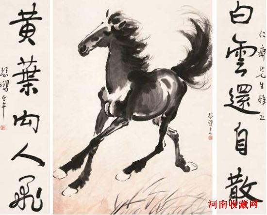 徐悲鸿 奔马、书法对联 画心:93×69cm;对联138×33cm×2