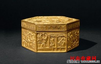 2121号拍品 清代 古典戏曲人物故事首饰盒 重量180克 上海老凤祥银楼加炼赤金,以纯金手工打造,工艺极为精美。整体由七幅画面所构成,运用精工模压、錾刻等工艺以古典戏典人物故事为主题,每幅画面刻画的都极为精细人物惟妙惟肖,是件难得的精品之作。