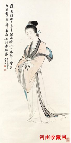上世纪四十年代,张大千带领弟子到敦煌石窟,用了近三年的时间,精心临摹了大量的壁画,这些临摹作品造型上主要吸取盛唐仕女的雍容华贵、娇媚高傲及健康秀美,色彩受佛教造像及藻井图案的影响,并参考了藏传佛教施用矿物质颜料的技艺。而上世纪三十年代,张大千主要是向唐寅、吴伟等人学习,这个时期的人物画造型温婉娴静、清雅小巧、风格灵秀,衣纹是以淡墨勾勒,用笔轻快简洁。此幅《仙女献寿》正是大千先生早期的作品,其用笔用墨秀润灵活,体态轻盈婀娜。发髻的钩皴细致,颇有质感,衣纹的行笔也自由流畅。这明显受到唐寅笔法的影响,笔调较为轻快,与从敦煌归来后丰腴饱满,雍容华贵的仕女形象相比,此幅作品人物面貌清新秀丽、弱质芊芊、媚而不俗,另有一番味道。
