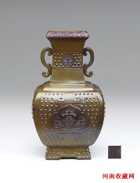 较之乾隆同时期的其它仿古颜色釉,仿古铜釉存世数量不多,拍品珍稀,格调高雅。目前唯一见到的类似器型和纹样的物件是台北国立故宫博物院的清乾隆古铜描金寿字方壶,两者之间的差别在于后者在器物的突起纹饰部位描以金彩。而该拍品保持最初一次烧成的古铜彩原色,更显古朴和端庄。