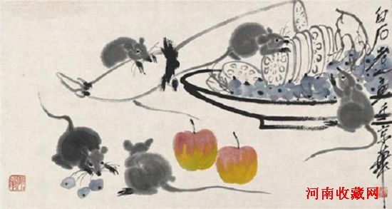 此画主角是五只子鼠,寓意五子登科,盘中莲藕、葡萄和前景苹果实属衬托。老鼠、莲藕、葡萄和苹果皆有美好寓意,老鼠、葡萄有多子多福的寓意,莲藕有连生贵子之意,苹果的“苹”与平安的“平”谐音,因而被誉为“平安果”。白石老人对动物充满慈爱之心,鼠是他最喜描绘的动物之一,在他眼里,鼠是机灵生动、顽皮可爱的小动物。画中五鼠形简意足,巧拙兼备,机敏伶俐,栩栩如生,充满喜气。画面鲜活有趣,充满明朗乐观的基调,是白石老人不可多得的写意佳作。
