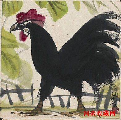 新浪收藏讯 《大吉图》采用方形近景构图,画雄鸡一只,昂首挺胸,威武前行。作者简化了背景环境的描写,突出主体形象,有如特写镜头。雄鸡一直为中国文人所赞美,有“一唱雄鸡天下白”等名句。鸡的“文、武、勇、仁、信”五德,代表了人们对道德的追求,也是许多画家爱画鸡的原因。且“鸡”与“吉”谐音,迎合了人们求吉的心里。此画以写意笔法绘制,雄鸡以水墨渲染而出,先淡后浓,眼、嘴、爪等细部用墨线勾画,再以赭色晕染。鸡冠以红色染出。方纸四周点缀绿叶,叶脉以淡墨勾出。林风眠的绘画中西融合,用中国传统工具材料表现传统题材,吸收了20世纪西方现代绘画的构图和色彩,追求构图的平面化和亮丽的色彩。林风眠的绘画以仕女、花鸟见称,此类动物题材较为少见,《大吉图》丰富了我们对其绘画面貌的认识。
