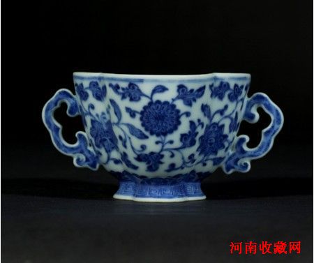 青花瓷常简称青花,是中国瓷器的主流品种之一,具有着色力强、发色鲜艳、烧成率高、呈色稳定的特点。明代青花成为瓷器的主流。清康熙时发展到了顶峰,乾隆时达到了登峰造极的程度,以纹饰繁密、染画工整、造型新奇取胜。这件“清乾隆 青花缠枝莲葵口双耳杯”杯形小巧,海棠形杯身,器壁较深,两侧饰如意形耳,底施白釉。外壁满绘缠枝花卉图案,绘画细腻,青花发色典雅,白釉肥润,为乾隆时期青花精心之作,极具收藏观赏把玩价值。
