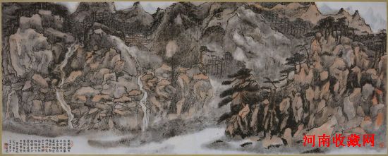 按:身为岭南人的赖少其久居安徽,特别受新安画派程邃的影响至深,得干笔渴墨,苍茫简远之法。寄居安徽将近30年中,他年年上黄山,为黄山写照,可以说,黄山的一树一石,无不收归赖氏笔下。他以师法传统为起点,又通过师法大自然使艺术得以升华。此作是赖少其1983年11月赴泰国举办画展时所创作的巨制。尽管寄居异国,但对黄山依然魂牵梦绕,所作梦中黄山,用王蒙干笔渴墨之法皴擦之,又以西画印象派着色之法渲染之,能摄黄山之神,充满诡秘幽奇的色彩,是赖氏写黄山中之杰构,其尺寸之巨,为市场所仅见。识者重之。