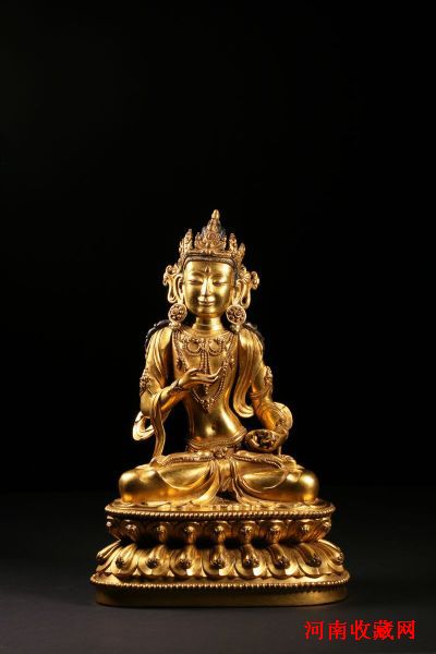 金刚萨埵是佛教密宗极为推崇的圣尊,他的身份具有双重特征。金刚萨埵有时作为菩萨出现,而在密教教义中,他又常常作为诸佛的统摄,具有法身的含义。此尊金刚萨埵腰肢微扭,金刚跏趺坐於仰覆莲台上。面相丰满端正,宽额,五官舒展匀称,眼睑略俯视,表情静穆柔和,略含笑意。头戴宝冠,束发高髻。冠带於耳後系扇形花结。垂下的发束搭於两肩,上有翻卷如小波浪的发卷。项圈下缀U字形连珠式璎珞,双肩宽厚,腰部收束,躯体柔软饱满。下身着长裙,腰间束带,腰带下仍以U字形连珠式璎珞装饰,手足处饰有钏躅。金刚萨埵结跏趺端坐於莲座上,右手当胸执金刚杵一端,左手持铃置於腰部,体态优美大方。莲座为束腰式,上下边缘各饰一周连珠纹,莲花瓣宽大饱满,周匝环绕,对称分布。莲座前方刻有“大明永乐年施”款识,为明代永乐年间宫廷制作的佛像。而面相独特、持物完好无损、全身镀金亮丽则是此像最突出的优点。作品整体造型完美,风格成熟,装饰繁缛,工艺精细,充分展现了明代宫廷艺术的精致与典雅。
