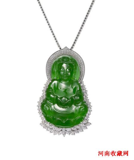 老坑玻璃种观音,此款玉料质地纯净、细腻,无裂无棉,色正、匀又够阳。细腻精准的雕刻工艺,把观音端庄慈祥的相貌刻制得惟妙惟肖。再加上钻石的映衬更是显得富丽堂皇,美不胜收。