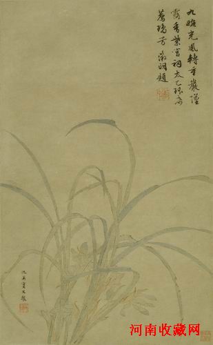 在画幅上空靠右处,有当时主持吴中风雅达三十多年之久的文徵明的取元陈旅题画兰诗(见四库全书本《安雅堂集》卷一)题跋:“九畹光风转,重岩坠露香。紫宫祠太乙,瑶席荐琼芳。”其诗意将画境巧妙点出,目下一丛似乎已经幻化而出,舂容登于款款礼仪之坛,让人遐想。根据北京故宫所藏文徵明画《湘君湘夫人》轴上王稚登的题跋称:青年仇英曾经亲炙文徵明的教导。而文徵明作为风雅盟主、宽厚长者,不拘一格提携后辈,如此形式的“仇画文题”,使得仇英这位不谙诗道的画家作品,顿然增色不少。可以说,仇英的画作,正是在以文徵明为首、包括其子弟门生在内的文人题跋赏会,使得他转而可以在文人画的谱系中占有一席之地。然而,这还有赖于仇英本人先天的绘画天赋和后天的雅逸熏陶:确实,从仇英这件《琼芳图》可以看出,他能以一种精工的技法造诣,营造出一种雅淡的趣味品格。