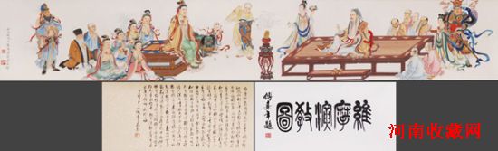 此件珍宝阁专场推出的《维摩演教图》颇有来头。《维摩演教图》是历来众多画家临摹的对象,丁观鹏等人皆临摹过此幅画。其原作传为宋白描大师李公麟所绘,现藏北京故宫[微博]物院。画的内容取材于佛教《维摩诘经》,描绘的是装病在家的维摩诘向奉佛祖释迦牟尼之命前来探病的文殊菩萨宣讲大乘教义的场面。画中维摩诘坐于锦榻之上,精神矍铄地谈论教义,对面的文殊菩萨脚踩莲花,双手合十,对维摩诘的说法心悦诚服。画幅中部绘天女故意往大弟子舍利弗身上撒沾衣不坠的花瓣,令躲闪不及的舍利弗连忙振衣抖拂。全图意在表现维摩诘所具有的高深机智及其对佛教教义的巧思善辩。