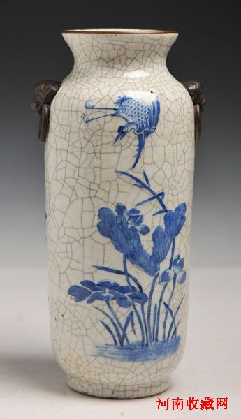 图3 清 哥釉青花一路连科凤戏牡丹图铁锈花双铺兽耳筒瓶