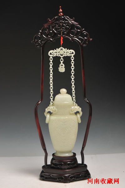 图5 现代 和田白玉宝相花纹双耳活环链子瓶