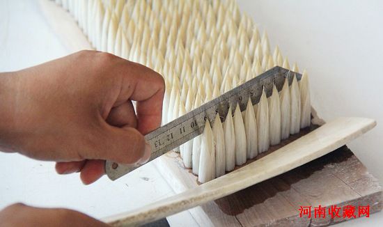 传统制笔工艺共有分毛脱脂—去绒—装毛—齐毛—垫毛—切毛—梳毛—修毛—成头等128道工艺,成品要具备尖、圆、齐、健‘四德’,软硬适中的标准,其外饰,尤其是笔杆的装饰上更极为讲究,根据笔的形状和高、中、低档的要求配之,既美观又大方。
