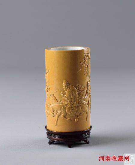 清道光黄釉高浮雕“踏雪寻梅图”笔筒