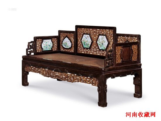 清中期 紫檀及黄杨嵌五彩花卉图瓷板罗汉床