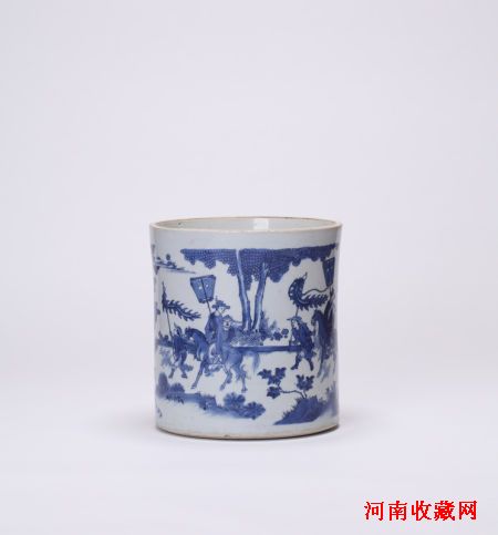 明崇祯“青花人物图大笔筒康熙”胎白细腻,釉质晶莹,画意流畅,青花色调呈纯蓝色,青翠明快。腹部汇有三位人物分别为新课殿试三甲:状元、榜眼、探花骑于马上,旁边各有两名随侍官吏,或牵马或执扇或打旗,姿态生动自然。锦地、日头、山石、芭蕉、括号云均为崇祯时期典型画工。明崇祯制瓷工匠不仅掌握了制作青花器的精湛技术,令青花发色沉稳、纯正外,还将中国传统的水墨画晕染法运用到瓷画中,令青花产生晕散效果,尤其是中山石岩层的画风,皴染得景致富有层次,人物栩栩如生,实为不可多得明崇祯时期的清雅精良文房器具。