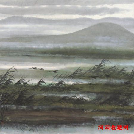 《芦雁图》作于1950至1960年代,为艺术家创作生涯的成熟之作。此件作品发表在台湾大未来画廊于1999年出版的《林风眠Lin Fengmian百年纪念文集》,并有多次重要展览记录。《芦雁图》笔触简洁娴熟,色彩推移过渡自然。优雅的鹭鸶嬉戏于尚不及膝的芦苇之间,黄绿色中裹着些许清透之墨,呈现了诗一般朦胧的优美场景。画家利用多层淡墨晕染画面的功力炉火纯青,在平远的视觉效果中兼顾适度空间感,成功营造出了西画强调的层次及光影。