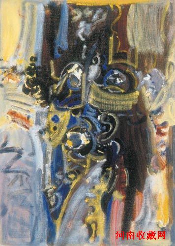 作为现代抽象绘画的拓荒者,吴大羽存世作品稀少,而在他有限的遗存中,又以“京韵”系列最为重要。《射戟辕门》正是此系列的代表之作,源自海外重要藏家,深藏20余载,著录繁多。吴大羽灵活自如的运用着他偏爱且拿手的普鲁士蓝、黄与黑色,谱出传统戏曲独特的韵律与节奏。笔触与笔触之间呈现出一种亦张亦弛的和谐,色彩的配合则于灵动中蕴含着一种智慧的平衡,完美的将京戏人物走位时生动的气韵和动势凝聚于画布之上。