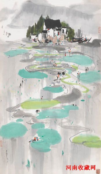 《滇池人家·云水居》创作于八十年,背景以渲染的墨色铺陈山形、浓墨点出屋瓦以及船桅;前景以淡彩、留白营造水田曲径的疏密空间;再由线条来萦绕画面,点点人群如音符一般富有节奏感。此作是艺术家对国画现代化及油画民族化理念的一次有益探索。