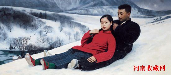 “天上人间”是王沂东的重要代表系列。《天上人间之二》以皑皑白雪为背景,女孩身穿红袄,眼神清澈的依偎在恋人怀中;男孩一身黑衣,专心致志地为女孩梳理头发,动作轻柔,充满眷恋,为我们诠释了一幅天上人间般美好的爱恋景象。乡土题材与雪景的结合,使得人物获得某种纯净的象征,同时又保持肖像画的特点。画面力图使古典油画方法与中国的平面装饰法相结合,以达意味深远之效。