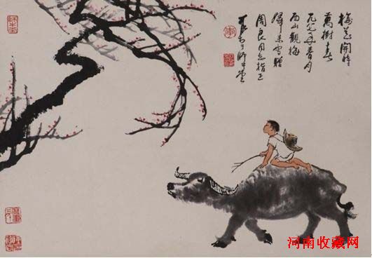 《梅花开时万树春》是可染先生晚年牧牛作中的精品,其主题是梅花树下牧归的牧童,表现了南方乡村的美丽景致。人物轮廓以焦墨粗线条作白描,人物肌肤施加赭石色调,牧童手持赶牛棍,悠然自得的坐在牛背上,抬头仰望梅花。牛的身体以水墨晕染而成,再用较浓的墨线勾勒牛背,加上浓墨绘嘴、眼、牛角和牛尾,充分描画出水牛身体的厚重和筋骨的强韧。画面左上角的梅花倾斜欹侧,采用折枝构图,截取表现一段,以浓墨勾勒枝干,以朱砂点画花瓣。李可染先生的牧牛系列作品具有浓郁的诗意,寄托了朴厚的感情。