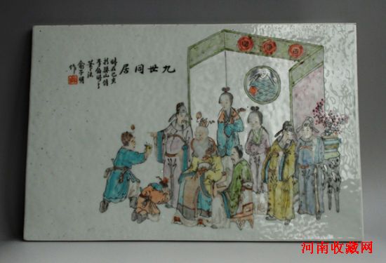 图6 【民国 俞子明(款)浅绛彩九世同居人物纹瓷板】