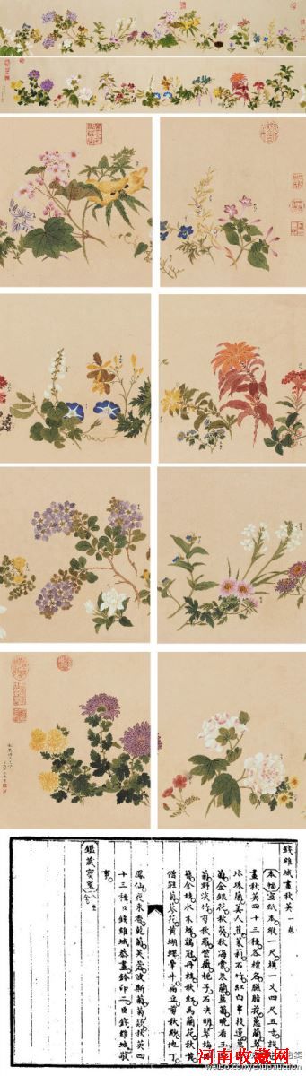 《画秋英图》在乾隆的收藏目录《钦定石渠宝笈续编》之中,原是在养心殿收藏的精品,养心殿是清乾隆时聚集心爱珍宝的地方,《画秋英图》藏于这里,可以想象此作也是乾隆的心爱之物之一。《画秋英图》的尺幅为31.5×334cm, 本作是一卷满庭芳华之作。一共描绘了43中花卉,花卉的工笔绘法精确工整,设色绚丽,尤其是卷末画菊,以双钩填彩画花,并以白粉圈染花瓣,再以没骨法画叶,令整体色调明净,黄菊清雅紫菊妍丽。