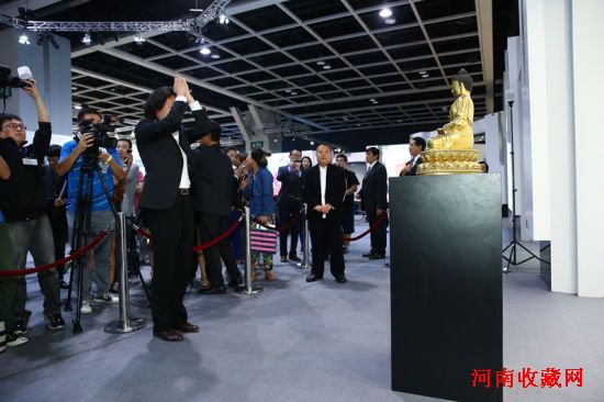 广东中山五觉斋主人郑华星先生(中)于10月8日以创纪录之2亿3,644万港元/3,000美元天价投得明永乐鎏金铜「释迦牟尼佛」坐像, 其艺术顾问─中国少数民族文物保护协会副会长一西平措先生(左)于拍卖后在佛像前顶礼膜拜。