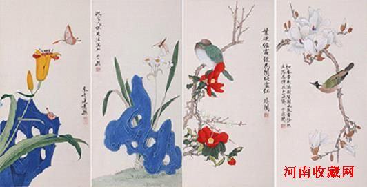 于非闇的单幅《辛夷蛱蝶》在北京嘉德2012秋季拍卖会中创下了385万余元的高价,此套《花鸟四屏》亦为于非闇工笔花鸟画中的精品,且传承有序,值得期待。