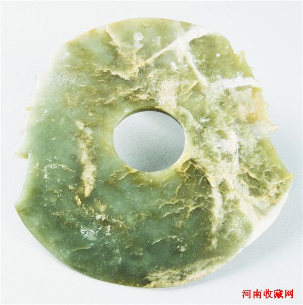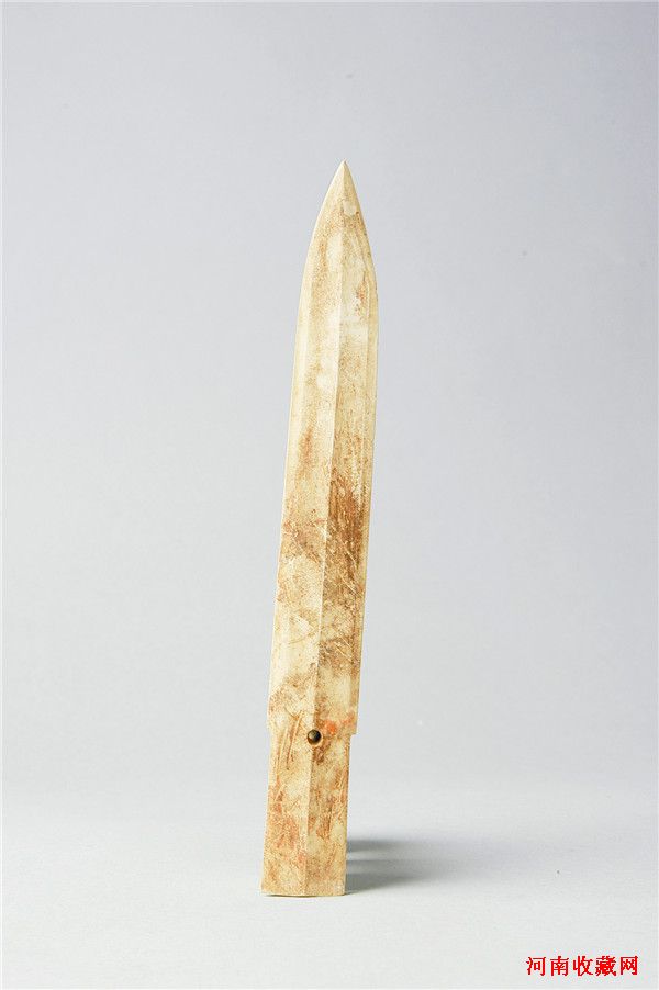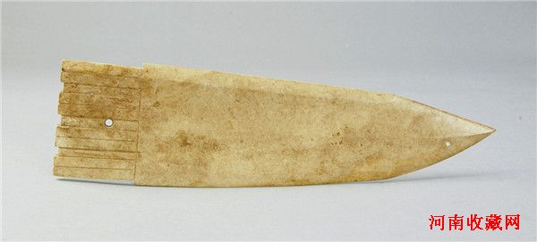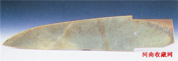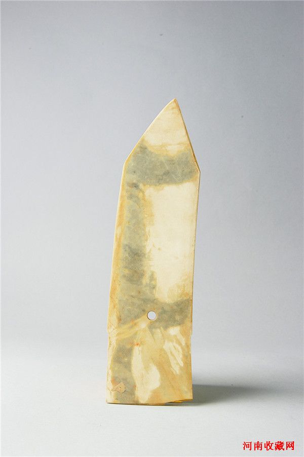 玉戈(图四)青玉。深豆青色,大部受沁而呈黄灰色或黄白色。玉质较细腻,微透明。锋呈斜三角形,锐利,援有脊与边刃,援本中部有一圆穿,援与内的宽度相差无几,内下角刻出一个小缺口。通长31.9、援宽8.8、内长7.3、最宽9、厚0.6厘米。