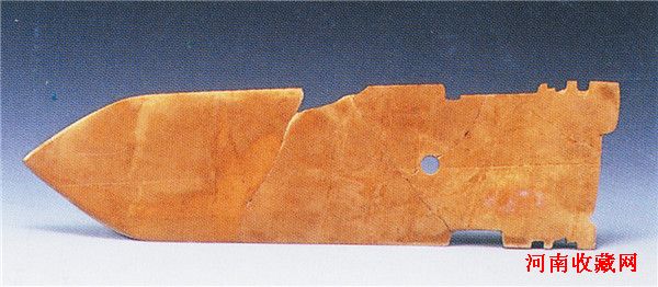 玉戈(图五)出于墓主腰部之下。已破裂成五块。中部边缘有一处稍残。青玉。浅豆青色,绝大部分受沁呈土黄色或灰白色。玉质细腻,微透明。背面纵向有一道锯切痕迹。锋大致呈三角形,刃较钝厚,援正面有脊,上边刃较钝厚,下边刃较薄,援本中部有一穿,内端上角有一长条形缺口,其上下边缘均有齿状扉棱。长25.3、援宽6.9、内长7.3、宽7.1、厚0.3厘米。