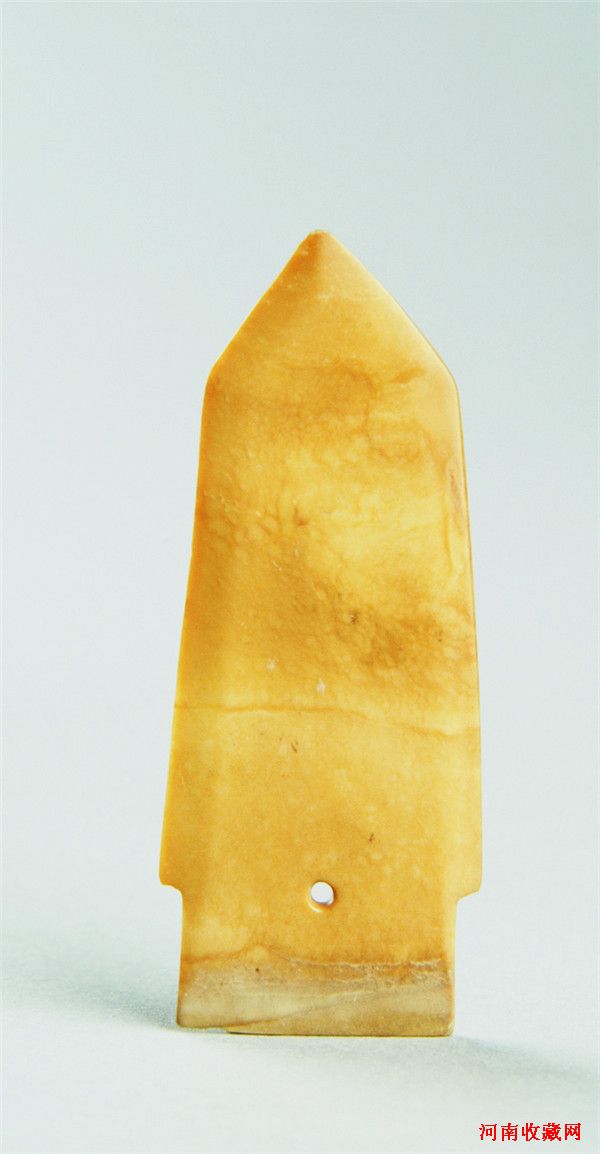 玉戈(图九)青玉。全部受沁呈土黄色或黄白色。玉质细腻,微透明。斜边三角形锋。直援,边刃锋刃均薄而锐利,直内。长6.7、援宽2.7、内长1,2、宽2.3、厚0.2厘米。