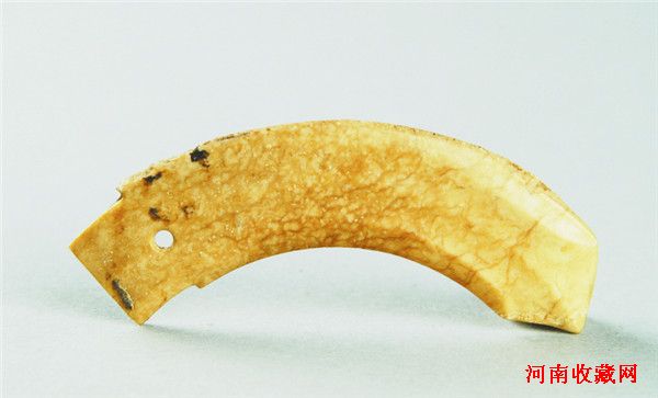 玉戈(图十)青玉。全部受沁呈黄色与黄白色。玉质细腻,微透明。三角形偏锋。器身弯曲,曲援有中脊,援本有一圆形穿孔,曲内。长7.1、宽1.8、厚0.3厘米。