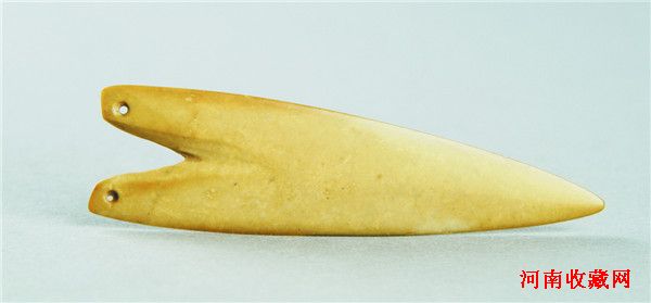 玉镞(图十一)青玉。全部受沁呈青灰色泛黄。玉质细腻,微透明。为无铤奴翼形镞,前锋及双翼边刃均薄而锐利,双翼尾端各有一个小穿孔。长8.3、器身中部宽2.2、厚0.3厘米。
