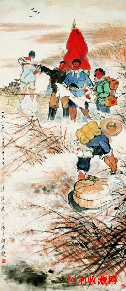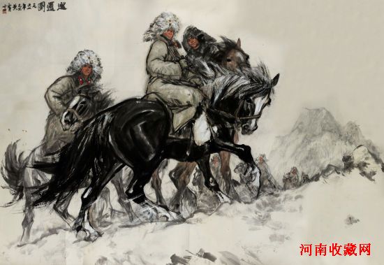 黄胄《巡逻图》足有五十六平尺之巨,可谓市场可见最大的黄胄作品。黄胄以速写式的笔法刻画出巡逻边防的解放军战士的形象,具有极强的视觉冲击力。寒冬里马背上的军人目光坚毅,整幅气势恢宏,与1960年国防部作为国礼送给胡志明主席的作品为同一主题。黄胄《青春之歌》描绘两个骑马涉水的新疆少女,色彩明丽、笔墨酣畅,将人物特征抓显定格,线条流畅有力,风格奔放。