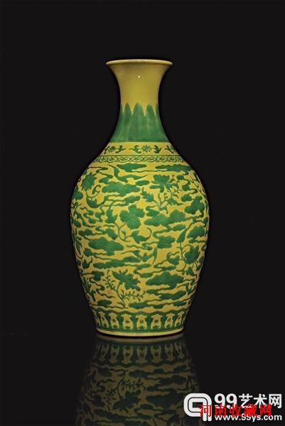 一件清雍正黄地绿釉划花折枝花卉云蝠纹瓶为本次拍卖的焦点拍品。全器满施黄釉为地,装饰其上的纹样以刻划轮廓线和细节之后再填施绿釉完成,颈、腹、近底处自上而下分饰以蕉叶纹饰带、折枝花卉云蝠纹、花瓣形纹饰带,具有吉祥寓意,出自欧洲私人收藏,1970年代由纽约古董商Frank Caro购自当地,届时,其将以15万至20万英镑的身价登上拍台。