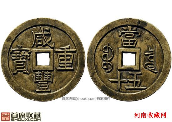 清钱是本次古钱部分的最大亮点,不仅有各式小平雕母、光绪宣统天下太平大型宫钱,更有“大清咸丰通宝”背“宝福一十”这样的名珍,估价35万-60万。当然最吸引人的还是宝泉当五百雕母,缶宝八贝,一笔一划如刀錾斧凿,勾画之间尽显咸丰大钱之魅力,此枚也是马定祥著《咸丰泉汇》第155页原物,估价150-220万,也是本次嘉德钱币拍卖分量最重的拍品。