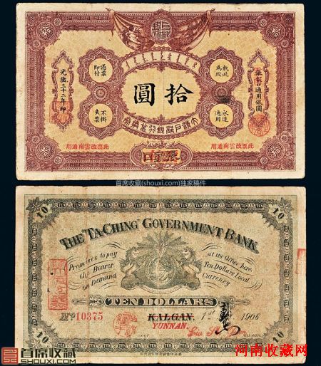 纸钞部分拍品号801-1594共计594件,从大明宝钞、大清宝钞再到户部官票,不乏清新拍品,八五成新两枚连号咸丰八年大清宝钞伍拾千文;八成新咸丰五年户部官票拾两连号三枚;九成新中国通商银行上海伍拾元单正、反样票。清钞部分的大名誉当属光绪三十二年(1906年)大清户部银行兑换券张家口改云南拾圆,加盖“此票改云南通用”此品种极为稀见,难得七五成新,估价20万-30万。